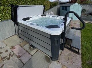 Make and Model: Platinum Spa, Model Infinity. (2100x2100x950mm) 6 seats including one lounger (91 jets) 32amp, 3kw heater, 2x3HP pumps and a circulation pump. Bluetooth, lights and jets